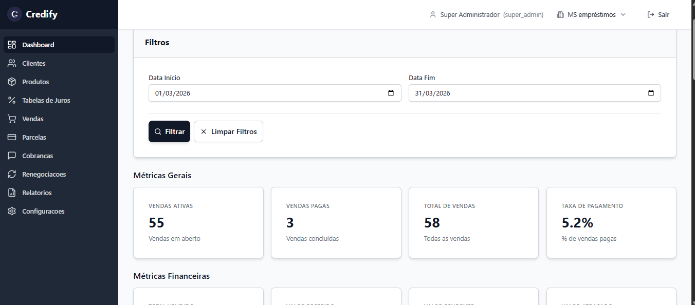 Sistema completo para gerenciamento de empréstimos com controle de parcelas, inadimplência, relatórios financeiros e dashboard administrativo.